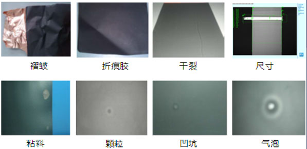 極片項(xiàng)目檢測:極片邊緣缺損面積檢測、極片折皺不良、接帶檢測、極片漏金屬檢測、貼膠露頭長度、貼膠垂直度檢測、膠紙是否蓋住極片、對位貼膠紙錯位檢測、有無保護(hù)膠紙檢測
